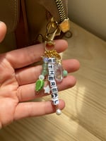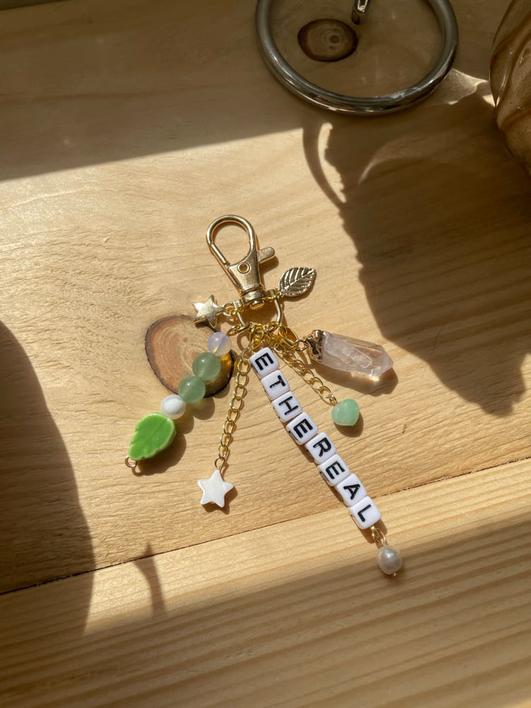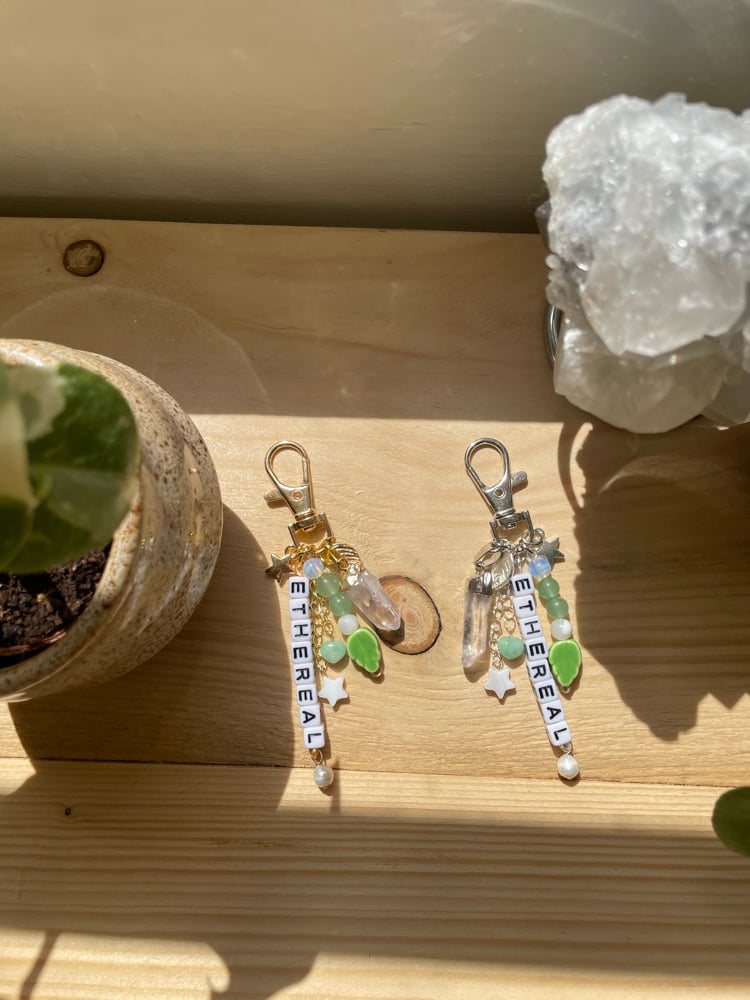 How cute are these ethereal bag tags - both a gold and silver option. Perfect to clip onto your favourite handbag, belt loop, car keys and more! Every one handmade and adorn a Clear Quartz chunk, mini Jade heart, mini mother of pearl star, string of beads with opalite, green aventurine, mother of pearl and a ceramic star and the cutest nostalgic letter beads finished off wire a little real pearl!