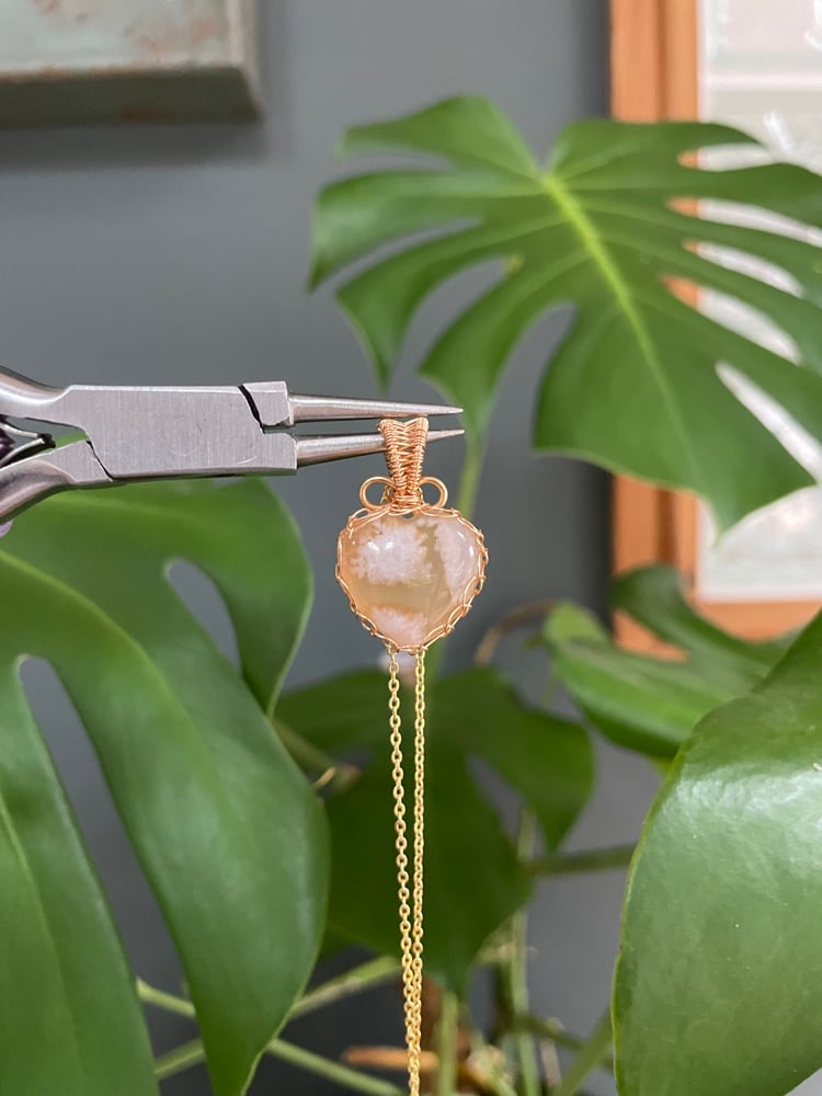 Gold Peachy Flower Agate Heart Crystal Necklace