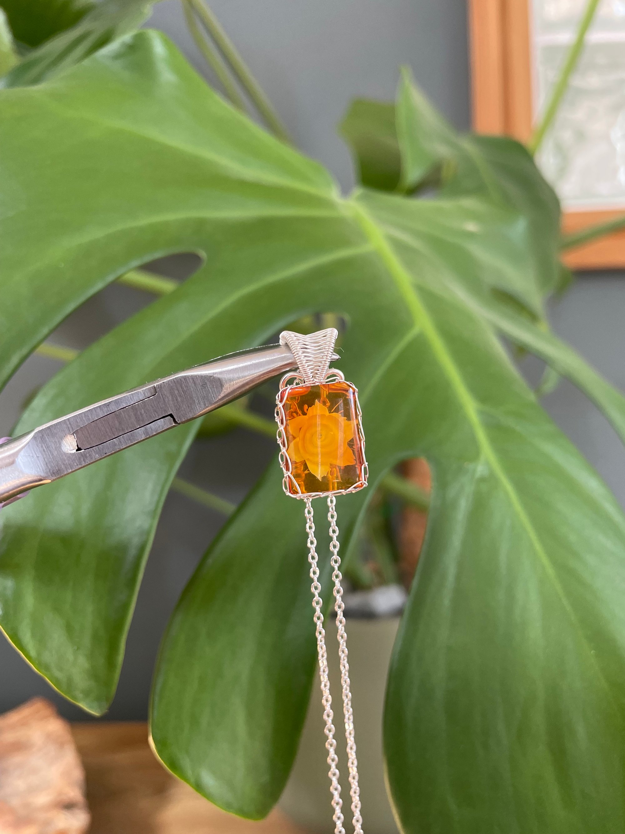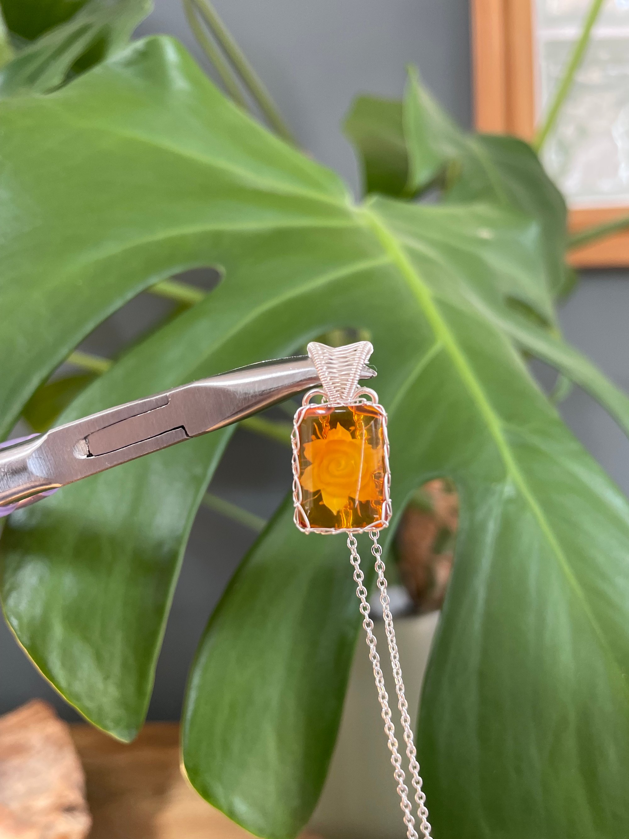 Silver Amber & Flower Carving Crystal Necklace